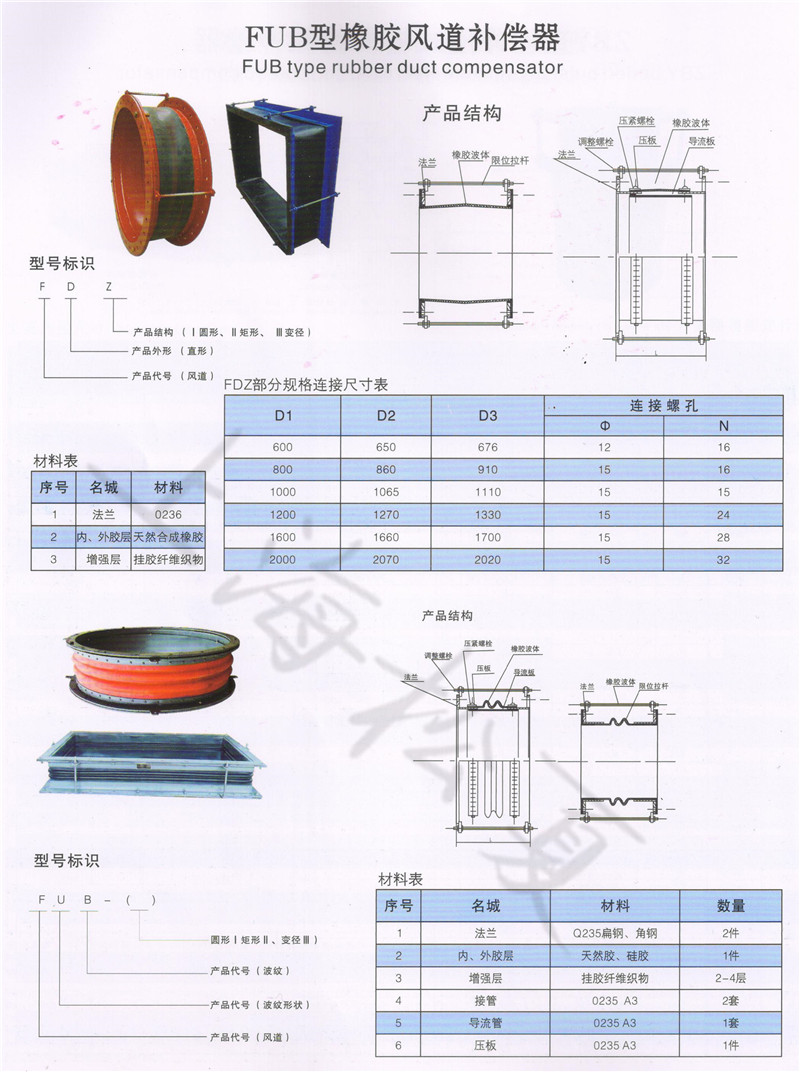 風道橡膠補償器分為FDZ、FVB、FUB、XB四種型號,由橡膠和橡膠一纖維織物復合材料、鋼制法蘭、套筒、保溫隔熱材料組成,主要用于各種風機、風管之間的柔性連接,其功能是減震、降噪、密封、耐介質、便于位移和安裝,是環境保護領域中一種較為理想的減震、降噪、消煙除塵的配套件。
