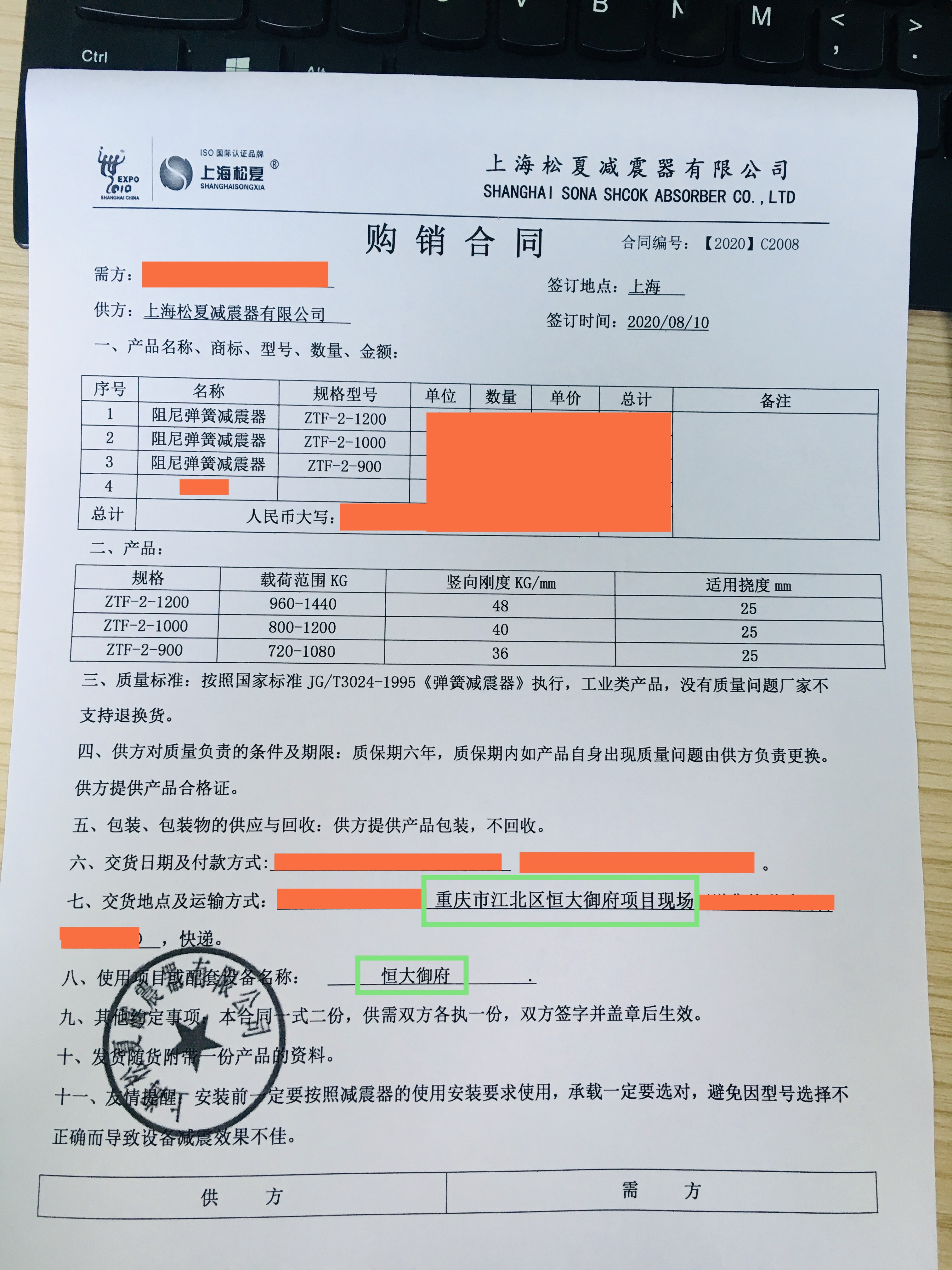 【恒大御府配套】上海松夏阻尼彈簧減震器合同介紹: